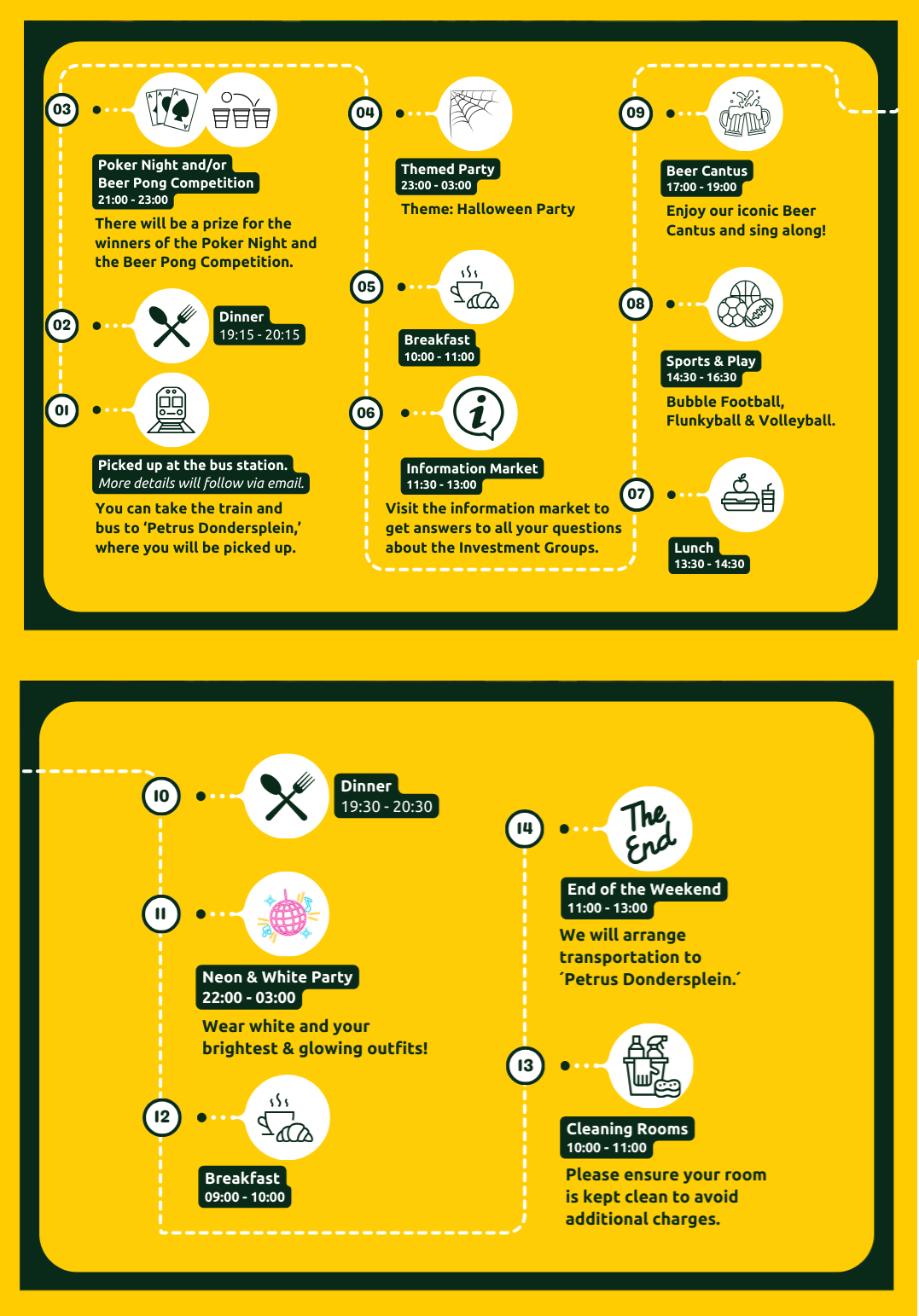 On the 3rd of October, we’ll trade the city buzz of Rotterdam for the green surroundings of Sint-Michielsgestel until the 5th of October! At the Introduction Weekend you can participate in many fun events such as the beer cantus, parties and much more. As a new member, you will be accompanied by the chair and treasurer of our Investment Groups so you can get to know them even better and prepare for the Formation Period where you ultimately have to choose your three favorite Investment Groups. See our Weekend Booklet for more information!