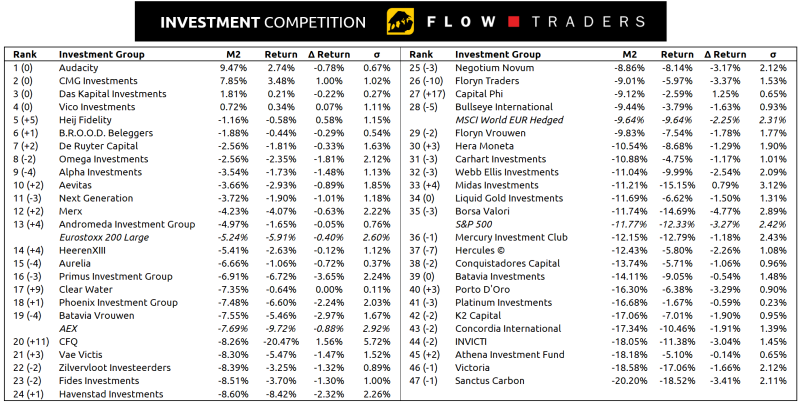 CFQ has risen 11 places to the 20th place. They have an M2 of -8,26% which makes them part of the peloton but with an absolute return of -20,47% -which is the worst in the field- they are not even hanging on in the race. So; they understand the M2 but don't seem to know how to make money.