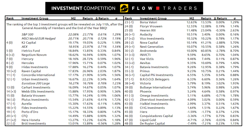 For the last 3 weeks of this year's Flow Traders Investment Competition the top 3 will be hidden again, till the winner will be announced on July 11th. Last week, Victoria climbed 4 spots by having a return of 3.02% in just one week. Furthermore, De Ruyter Capital is still in last place, can they still prevent themselves from finishing last in the competition?
