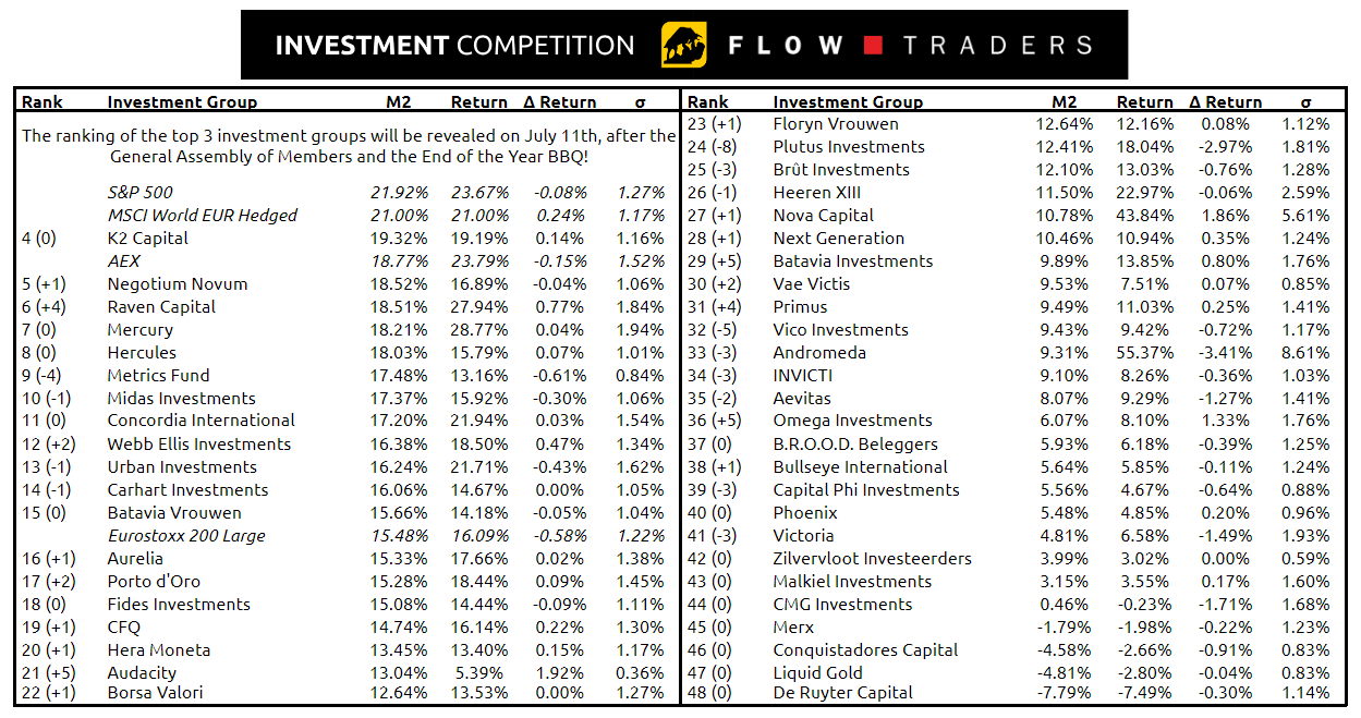 With only four more days to go it's getting more and more exciting. The competitions' top 3 still exists of Asteria, Floryn Traders and Heij Fidelity, but which investment group will manage to end up in first place? The winner of the 2023-2024 Flow Traders Investment Competition will be revealed on July 11th after the GAM and End of the Year BBQ!
