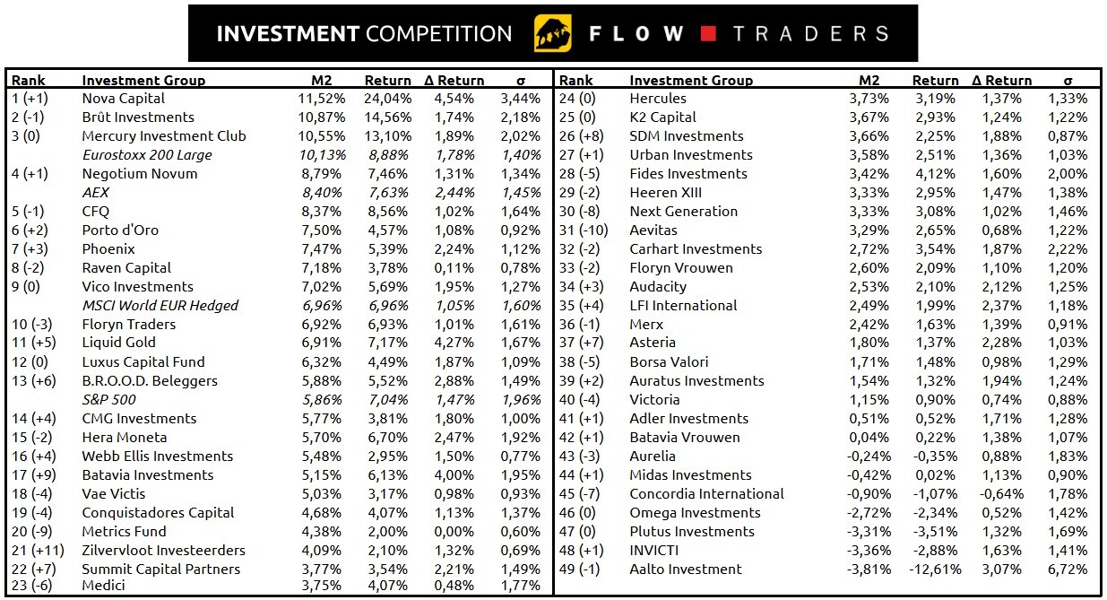 We have a new leader! Nova Capital has taken the top spot with an impressive 4.54% delta return, pushing Brût Investments to second place. This marks an end to their impressive 7 week reign. Will they be able to get it back together and push for first place again? Mercury completes the top three, pulling away from the rest of the competition.