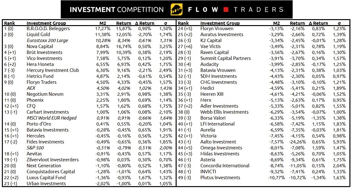 This week saw relatively few shifts in the rankings, with most groups changing only one or two positions. However, Liquid Gold experienced a significant decline in returns, further widening the gap with B.R.O.O.D. Beleggers, who remain firmly in first place. They now hold a comfortable lead with a 17.27% M2, but they should not become too relaxed, as the competition can shift rapidly.