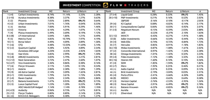 The latest Flow Traders Investment Competition update sees Carhart Investments leading the table, with Auratus Investments and Phoenix close behind as the fight for the top spot intensifies. A major highlight this round is CFQ, which posted the strongest absolute return of the competition, while several teams continued to make sharp moves up and down the rankings. With this being the second-to-last round, investment groups have just one more week left to make their final push and secure victory in the competition.