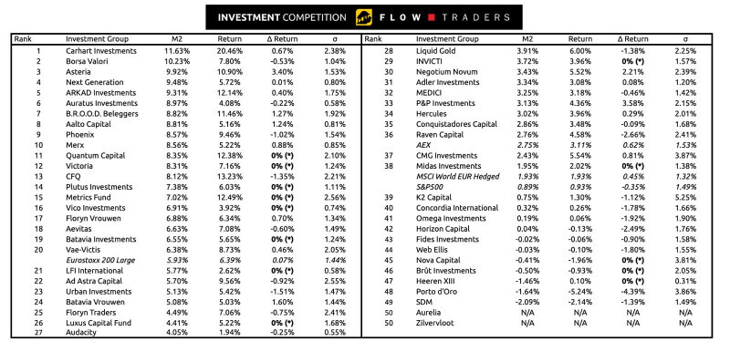 The final results of the Flow Traders Investment Competition are in, with Carhart Investments claiming first place after an exceptional run, highlighted by an impressive 20% absolute return!