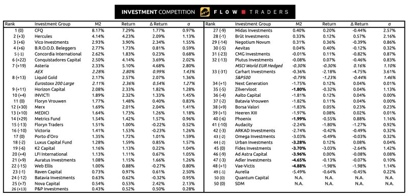 The latest update of the Flow Traders Investment Competition once again brings significant movement across the rankings. CFQ remains in first place, while Hercules and Vico Investments have climbed into second and third after strong weekly performances. Conquistadores Capital, Merx, and Metrics Fund are among the standout performers, making impressive advances up the leaderboard.
