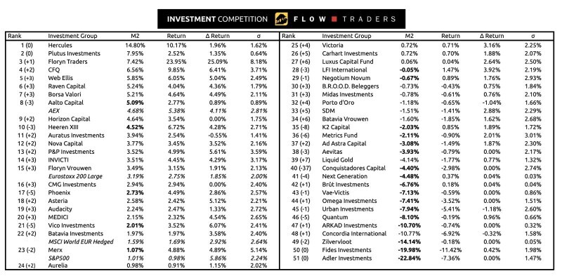 The latest update of the Flow Traders Investment Competition sees Hercules further solidify its lead at the top, continuing its strong run with another impressive return. Plutus Investments holds onto second place, while Floryn Traders jumps into third after delivering one of the standout performances of the week.